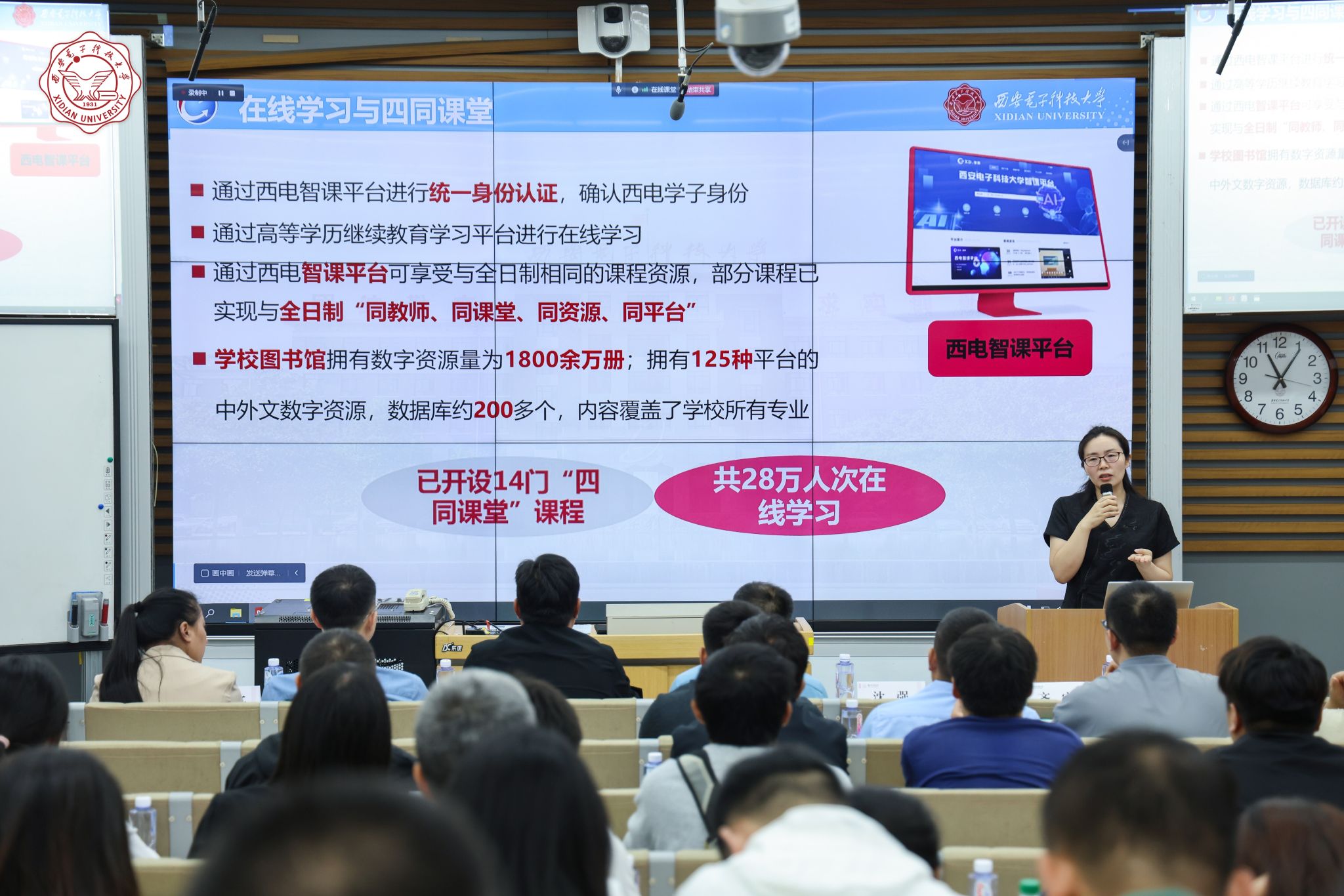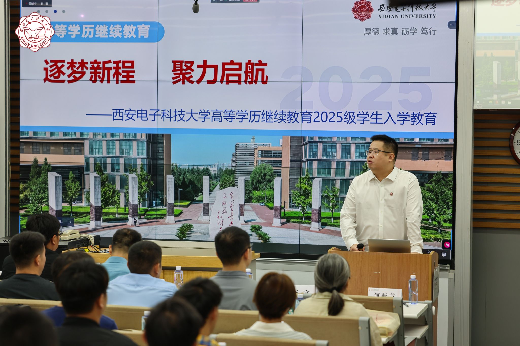 沈强院长以“逐梦新程,聚力启航”为题为学生作了入学教育报告。他首先系统回顾了西电自1931年创办以来波澜壮阔的历史沿革和发展历程,讲述了学校的学科建设布局、前沿的科研实力与雄厚的师资队伍水平。聚焦学院自身,他介绍了学院的基本情况,人才培养理念和特色模式,以及在推动继续教育高质量发展方面的创新实践,尤其是依托“西电智课”“eMOOC联盟”平台开展数字化教学的成效与规划。