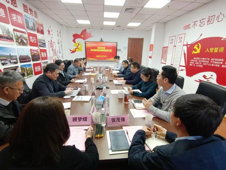 12月15日下午,杭州研究院党委书记邓军、执行院长姜文一行来买球的app排行榜前十名推荐调研交流。双方就学校继续教育发展、非学历业务转型开拓与资源共享共建等展开交流座谈。院长沈强及领导班子成员、相关科室负责人参加座谈。座谈会由学院党总支书记张武军主持。